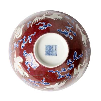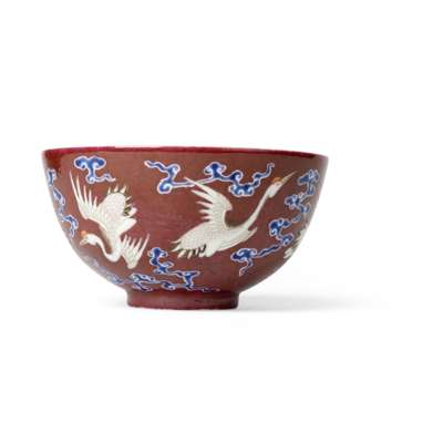 RUBY-RED-GROUND BLUE-ENAMELLED 'CRANE' BOWL