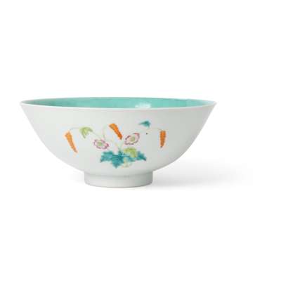 the splayed sides supported on a straight foot, the exterior painted with large pink flowerheads issuing from leafy branches, the interior covered in turquoise glaze, the base inscribed with an apocryphal six-character Qianlong mark in iron-red