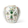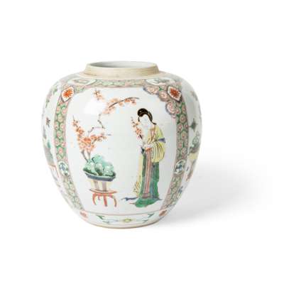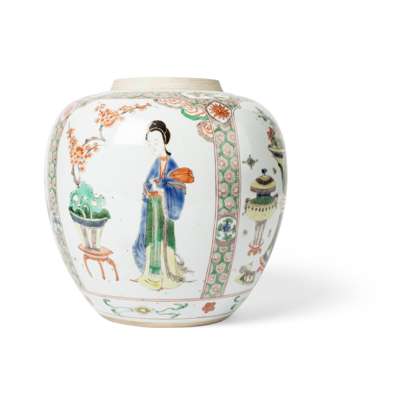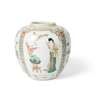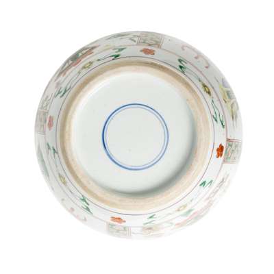painted in four shaped panels with ladies alternating with bogu motifs against a diaper ground, the base with a double-circle in underglaze blue