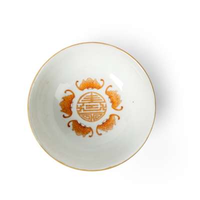 the exterior painted with four roundels respectively including a Chinese character reading 'Wan, Shou, Wu, Jiang (endless long life)', all between a stylised wan-swastika symbol with ribbons amongst clouds and above swirling waves, the interior painted with a shou-longevity symbol encircled by five bats, the base inscribed with a six-character Guangxu mark in iron red