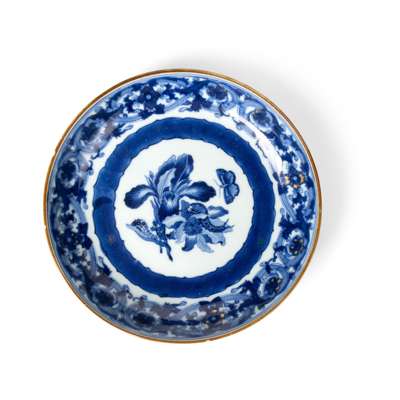 painted in rich blue and heightened in gilding, the centre with two caterpillars crawling across a spray of exotic flowers and a butterfly hovering over them, flowers and insects painted with exceptional detail and very well-shaded, within a decorative dark blue band and an elaborate European style strapwork border, of which gilding still visible, the reverse painted at the rim with a trellis-work diaper, the rim with a brown wash