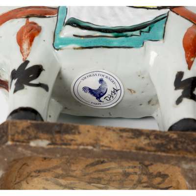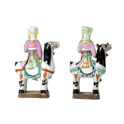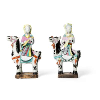 Note: Wang Zhaojun, also known as Wang Qiang, was known as one of the Four Beauties of ancient China. She was sent by the Han dynasty Emperor Yuan to marry the Xiongnu nomad chieftain Huhanye in an attempt to promote peace and stability between the two courts. The present figures depict an occurrence in Wang's journey north across the steppe, when the beauty of her voice caused a flock of geese to forget to flap their wings and fall to the ground; hence she is also known as 'falling wild goose'. Her image, holding a pipa whilst riding on a horse (see image 1) similar to the present examples, was depicted on a woodblock print book Li Chao Ming Yuan Shi Ci 歷朝名媛詩詞 published in the thirty-eighth year of Qianlong reign, corresponding to 1773AD. A closely comparable example of similar design and colour palette was sold at the Guest & Gray Gallery, London, Ref: Y913.