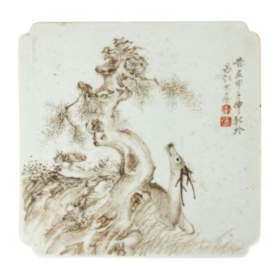 GRISAILLE-DECORATED 'PINE AND DEER' SQUARE PORCELAIN PLAQUE