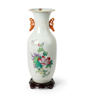 the baluster form, one side painted with a group of ladies wearing the most fashionable costumes of the period, the reverse further painted with various flowers, inscribed and signed, the neck flanked with a pair of stylised ruyi-head handles, with a wooden standDimensions
