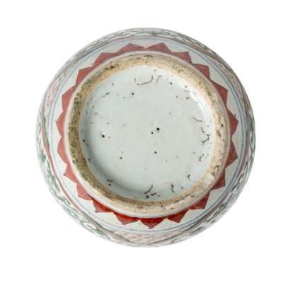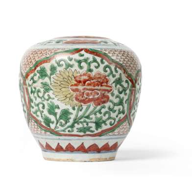 the body painted with large red peony and yellow chrysanthemum flowers in three interlocking foliate cartouches, all below a band of flowers around the mouth