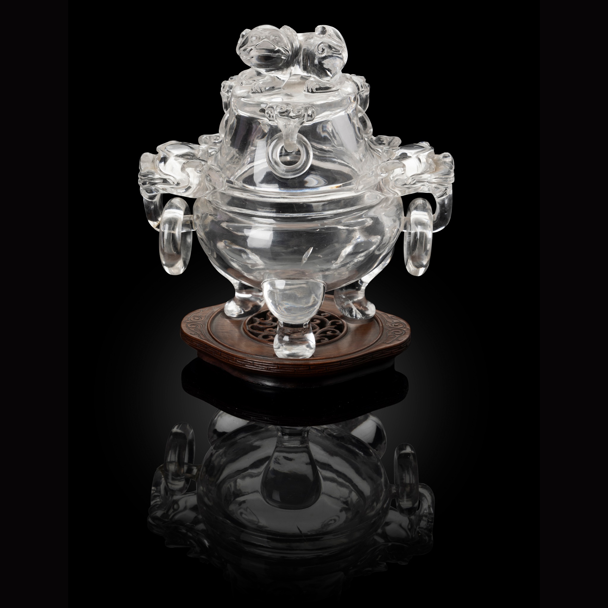 清末民初 水晶雕獅耳銜環三足蓋爐 帶木座