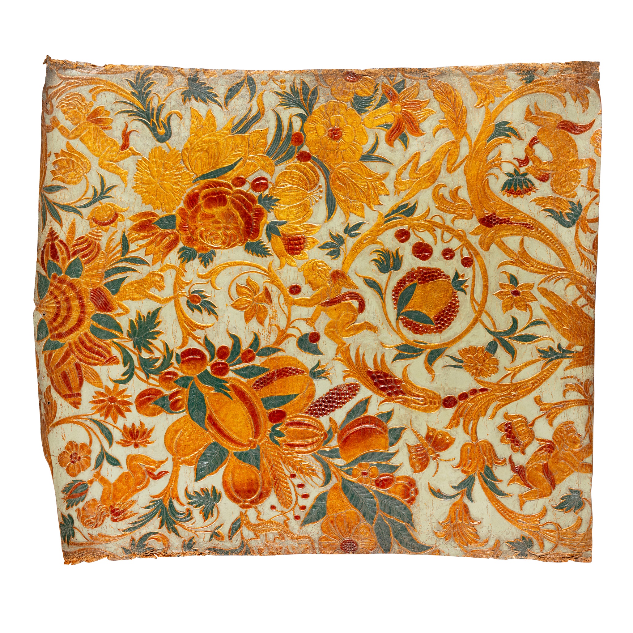 SECTION OF GILT EMBOSSED LEATHER PAPER, KINKARAKAWAKAMI, WITH ANGELS AND VEGITATIONS