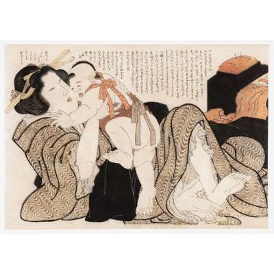 an oban yoko-e shunga (erotic picture) print from the series Fukujuso (The Adonis Plant), depicting a sexually fulfilled woman lying down and playing with her infant son, talking to him with humour and candour, extolling the exploits of his father the previous night
