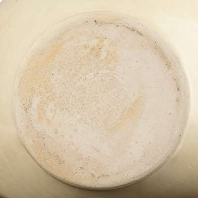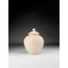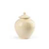 finely potted with an ovoid body on a flat foot, rising to short waisted neck and everted rim, the domed cover surmounted with a bud-shaped finial, covered overall in an ivory-coloured glaze, leaving the base unglazed revealing the buff body