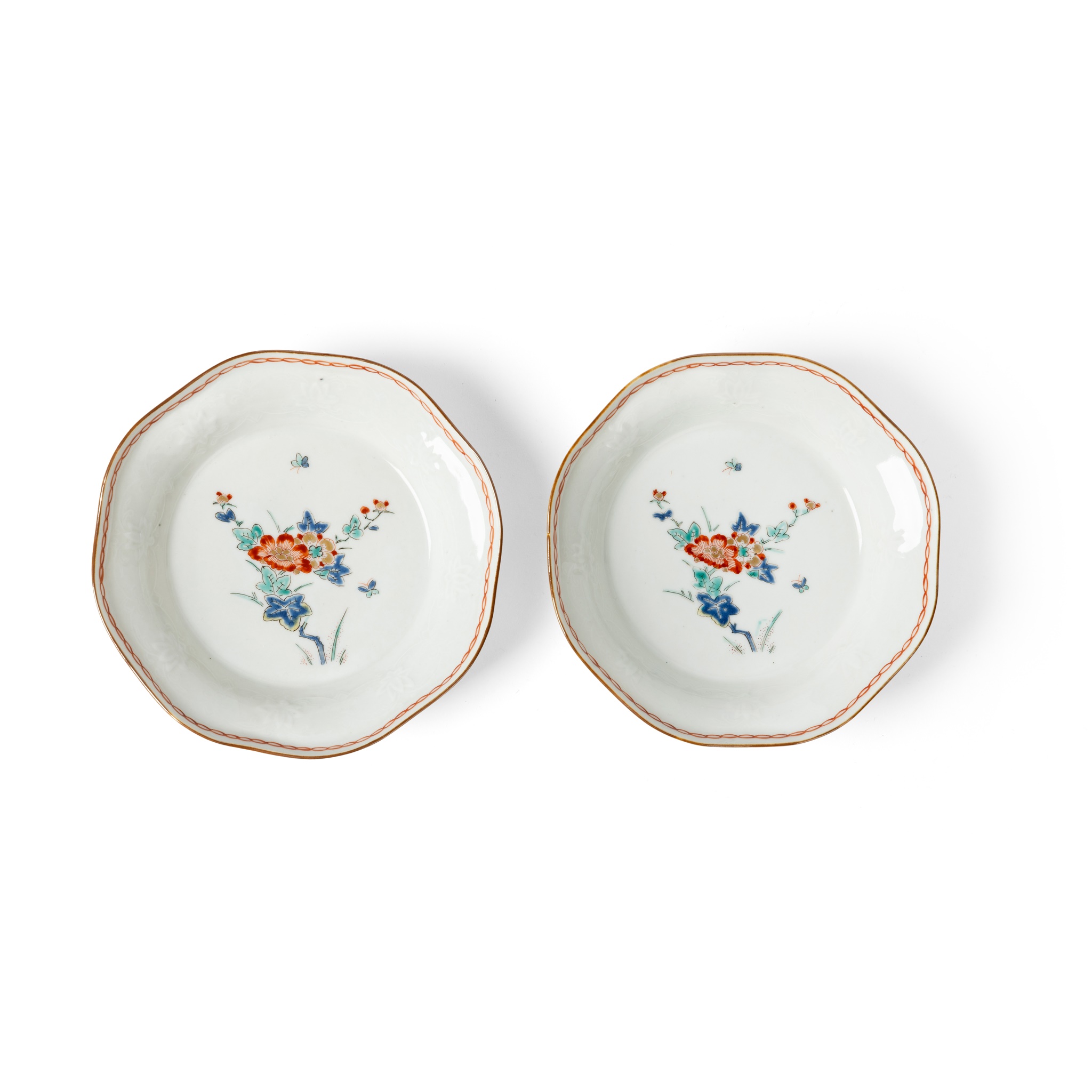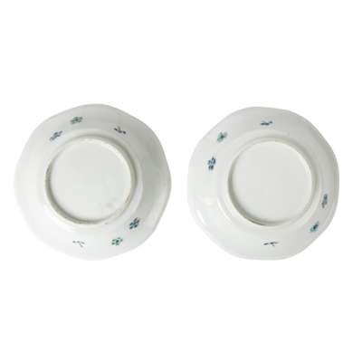 each of rounded octagonal form, painted to the centre with floral sprays and butterflies, the cavetto with moulded floral decoration
