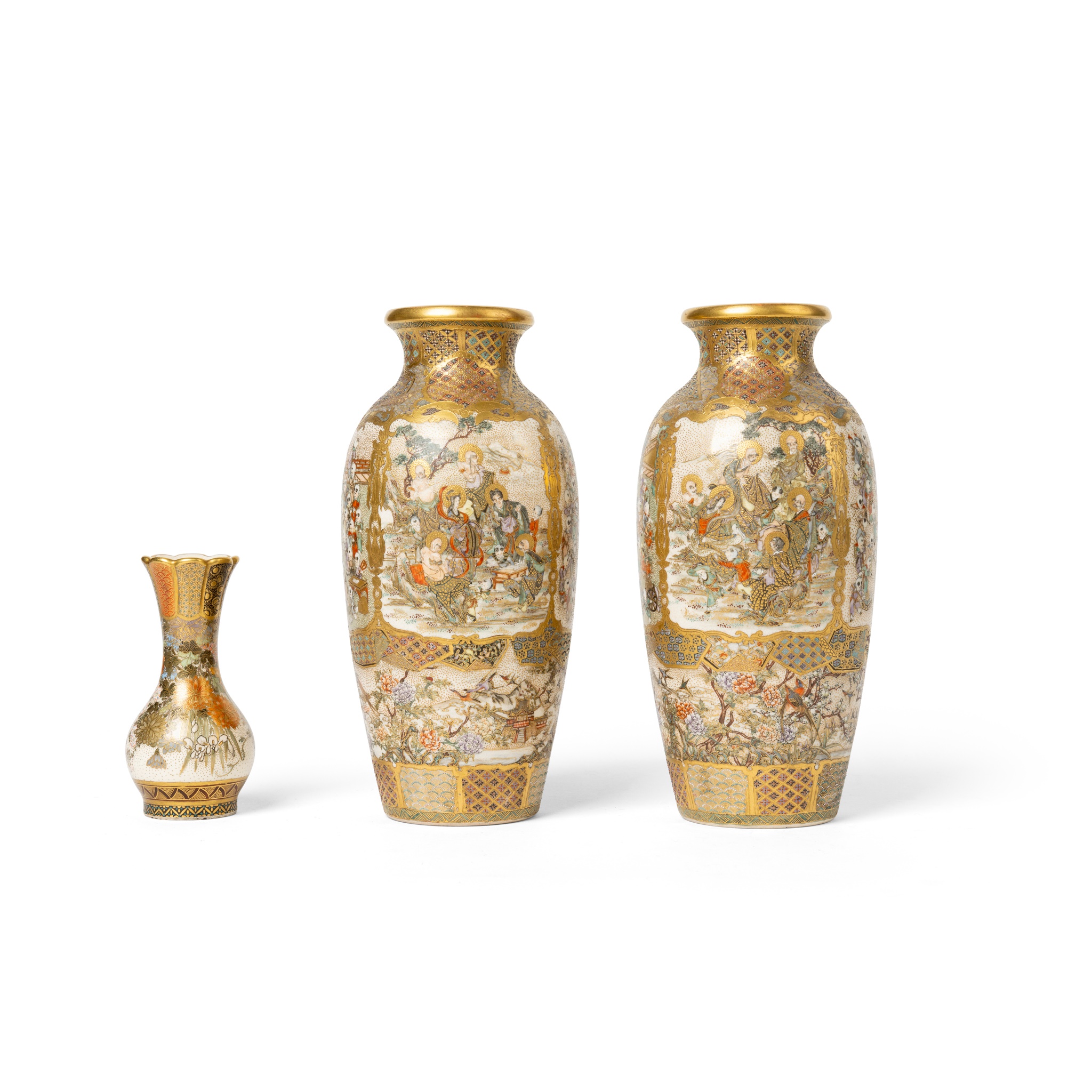 comprising: one small vase with foliate mouth rim, the body minutely painted with various flowers, the base inscribed with a two-character 'Shizan' mark in rectangle; together with a pair of baluster vases painted with various scenes, including kannon and rakans, boys at play and birds on flowering branches, the base inscribed with a three-character 'Toyoyama' mark