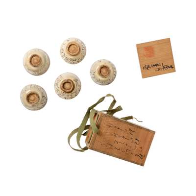 each carved on the exterior with poem, covered in a ivory tinged glaze with fine craquelure, with inscribed and sealed tomobako