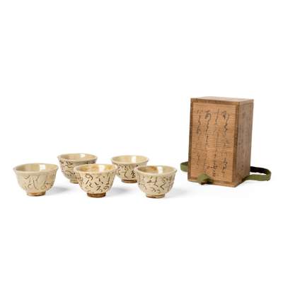 SET OF FIVE INSCRIBED STONEWARE SAKE CUPS
