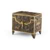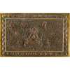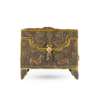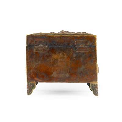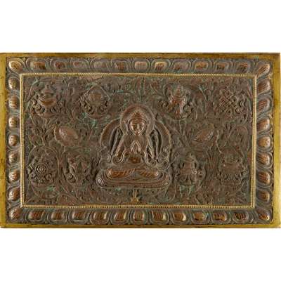 the rectangular hinged box and cover raised on bracket feet, worked with Buddhistic animals, mythical beasts and dragons on a dense foliated ground with lotus flower heads, top of the scalloped lid decorated with a four-armed Boddhisattava surrounded by the Ashtamangala borne on lotuses issuing from dense scrolling foliage, the back etched with the 'All-Powerful Ten' interlocking syllables