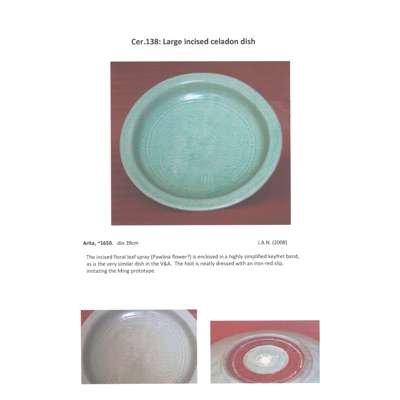 Note: Comparable examples of celadon glazed chargers, Arita or Hasami, dated to ca. 1660, sold at Christie's, one in London, 9 Nov 2008, lot 96, note the similarity of the key fret border; the other Amsterdam, 21 May 2003, lot 458, note the comparable rendition of the foliage in the centre.
