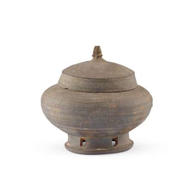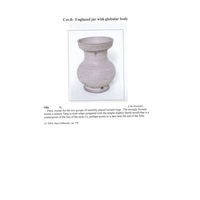 The band of half circle with a dot on the shoulder, almost obscured by the cover of the jar, are a primitive form of decoration, perhaps placing the piece at the beginning of the unified Silla. Compare this decoration with the cover of an urn, Unified Silla Period, previously in the Charles Bain Hoyt (1889-1949) collection, is now in the Museum of Fine Arts Boston, accession no. 50.959a-b; Another comparable example of a jar with cover, Unified Silla Period, is in the National Museum of Korea, accession no. Jeung 145.