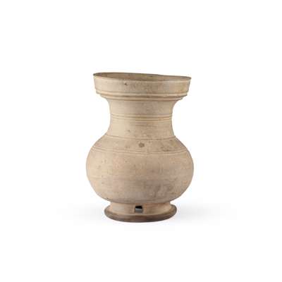 Note: A highly comparable example of a pierced foot mounted jar with long neck, Silla Kingdom, is in the National Museum of Korea, accession no. Sinsu 13876; A related stoneware jar with natural glaze in places but without the dish-like mouth, Unified Silla Dynasty, is in the British Museum, museum no. 1992,0615.26; Also compare to a footed jar with an incised wave design, Silla Kingdom, is in The Metropolitan Museum of Art, accession no. 1997.34.11.