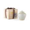 elegantly potted on a counter-sunk foot with steep sides, broad rounded shoulders, short-waisted neck and lipped rim, top of the cover with subtle steps and surmounted by a bud-form finial, covered overall in creamy white glaze with a tinge of greyish green, with a wooden tomobako