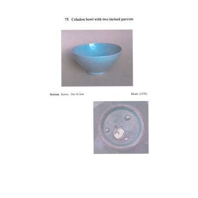 Note: As an auspicious pattern signifying harmony, a parrot design was widely adopted in the earliest days of Korean celadon from the Chinese Yue ware, and particularly popular between the twelfth and early-thirteenth century. The pattern commonly features a pair of parrots, but this bowl contains three such birds. A highly comparable example, also incised with three parrots, Goryeo Dynasty, is in the National Museum of Korea, accession no. Deoksu 164, also see Cleveland Museum of Art, museum no. 1918.482. Examples with a pair of parrots are in several museum collections, compare to one in the British Museum, museum no. 1973,0726.393, one in the Cleveland Museum of Art, museum no. 1924.136., and the other in University of Michigan Museum of Art, accession no. 1965/2.69; Also see examples in the open market, one sold at Christie's New York, 21 July 2016, lot 34, and the other at Sotheby's New York, 30 Sep 2020, lot 1070.