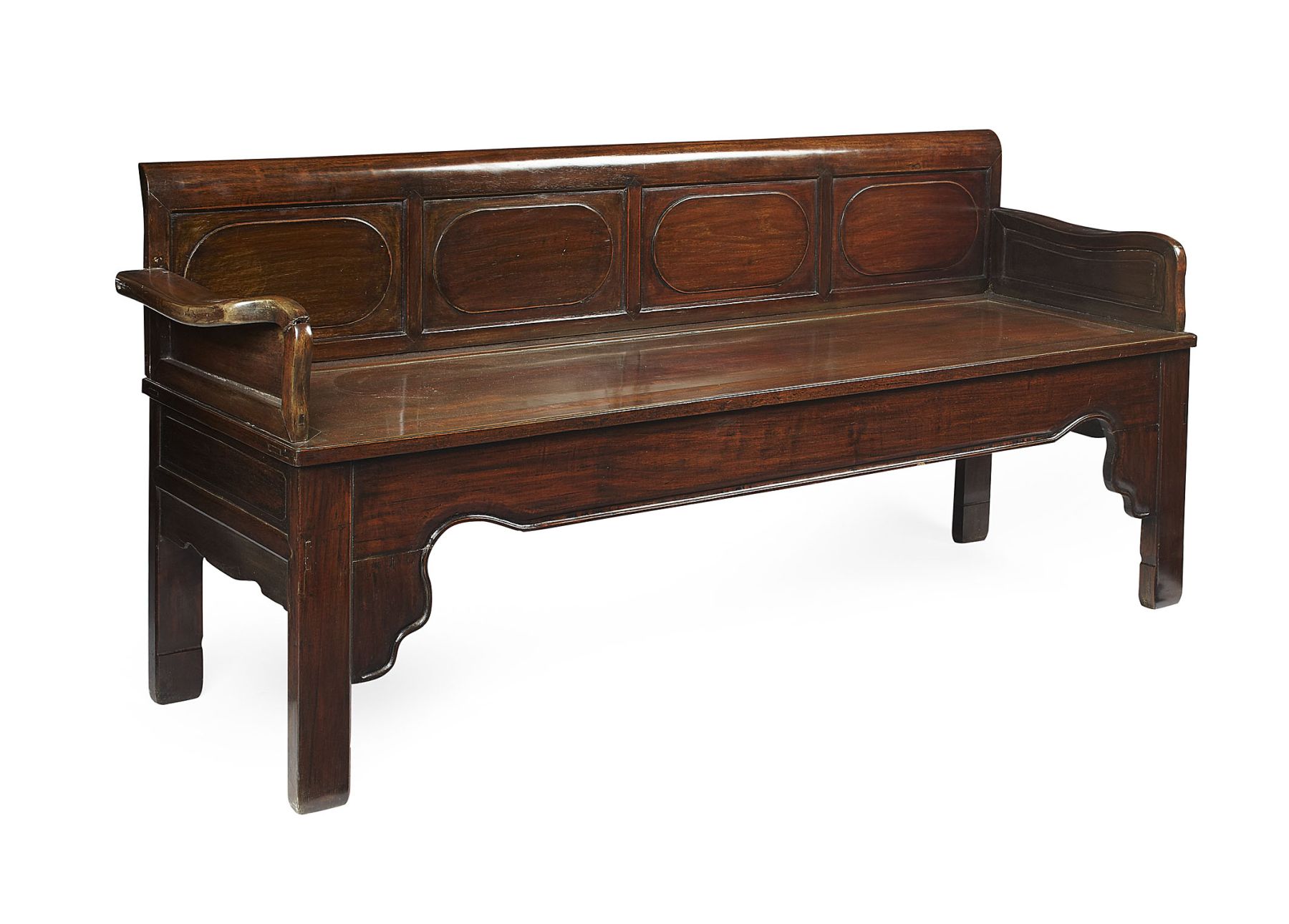 the rectangular quadruple panel back over a long panel seat and enclosed panel arms, over a scrolled apron, raised on straight legs