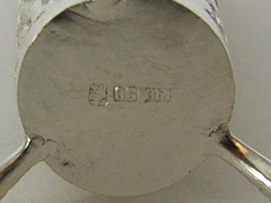 marked WH, 90, character mark, of cylindrical form on three raised hoofed feet, with embossed bamboo foliage on a planished background