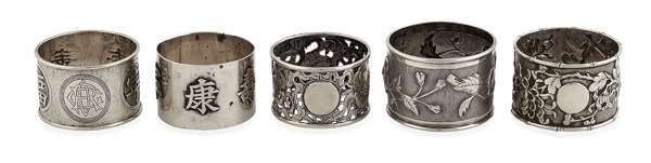 GROUP OF FIVE CHINESE EXPORT SILVER NAPKIN RINGS