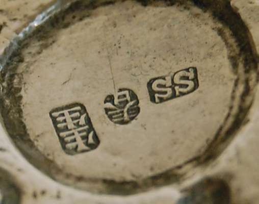 Sun Shing, marked SS, two character marks, bamboo edging, embossed foliage on a planished background with circular flaming pearl cartouche; Cumshing, marked CS, character mark, pierced with repousse dragon, foliate and sun decoration; Zee Shun, marked ZEESHUN, character mark, four chased characters in circular cartouches on planished background, with central monogrammed catouche; Kwan Wo, marked KW, character mark, applied Chinese characters with blank circular cartouche; unknown maker, three character marks, raised edges, embossed floral decoration on a planished background (5)