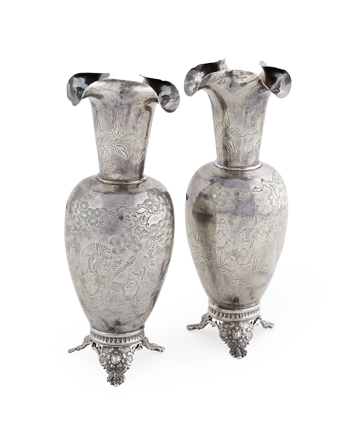 character marks to base, each of tapered shouldered form with everted tri form rims, the bodies engraved with scholars within classical landscape, raised on three bracket feet
