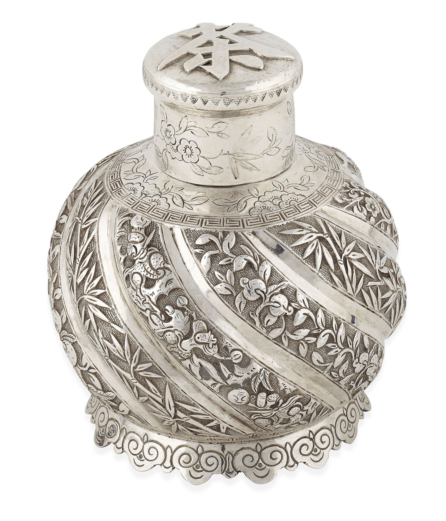 marked to base with character mark, the bulbous body with chased alternating panels of foliage and dragons, the pull off cover with character applied, raised on a scalloped chased foot rim