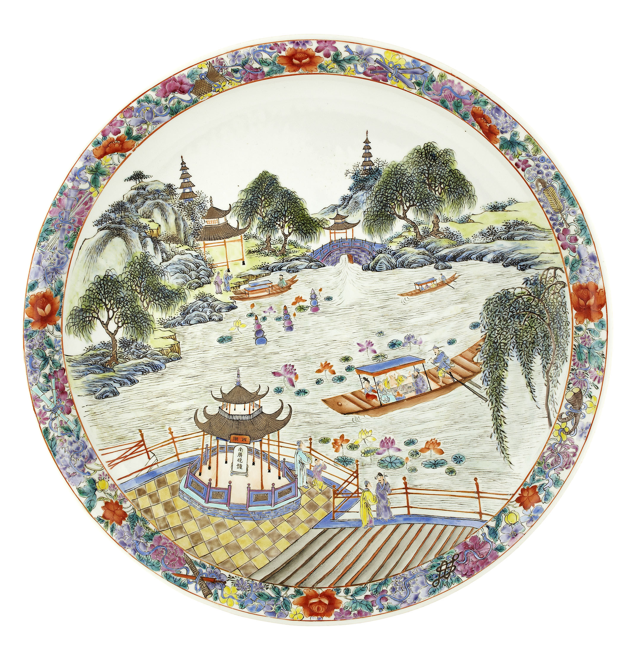 painted in famille rose enamels with an extensive river scene with figures on boat and by pagodas on the shore, within a foliate border, six character script mark in underglaze blue