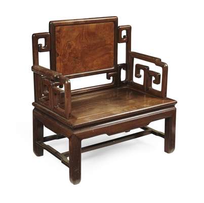 CHINESE HARDWOOD AND BURR WOOD ARMCHAIR