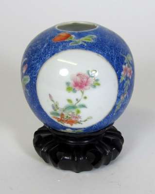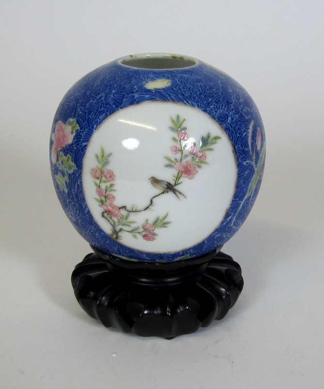 of globular form, painted in famille rose enamels with three circular panels of flowering branches on a scratched blue enamel ground painted with flower sprigs, six character seal mark in red