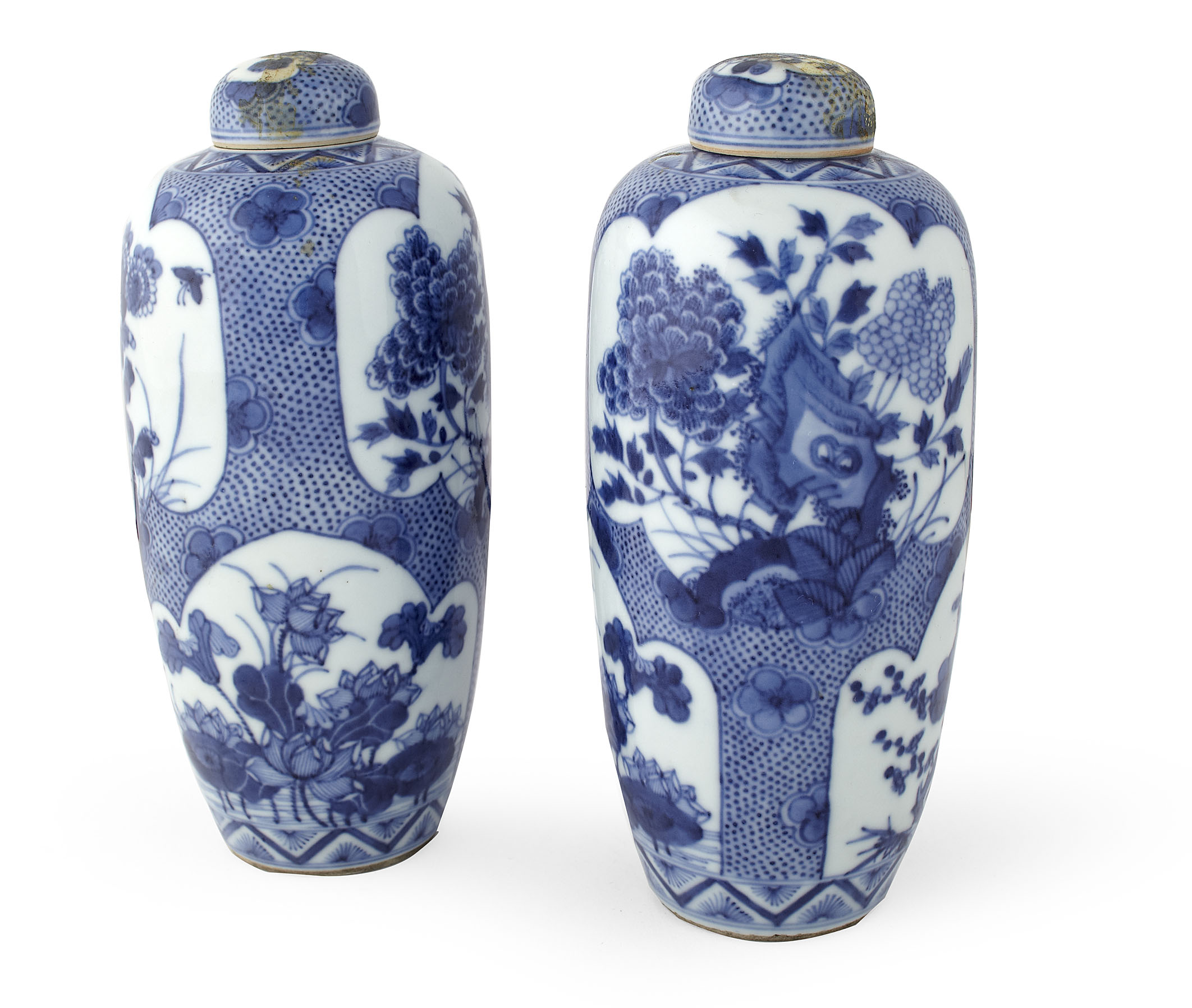 PAIR OF CHINESE BLUE AND WHITE COVERED TEA CADDIES