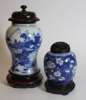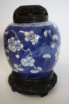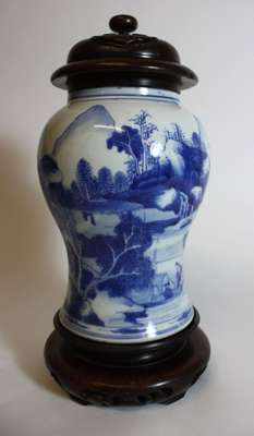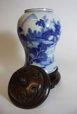 with a hardwood cover and base, the baluster sides painted with figures within a mountainous landscape 28cm high; together with small Chinese blue and white covered ginger jar, 16cm high (2)