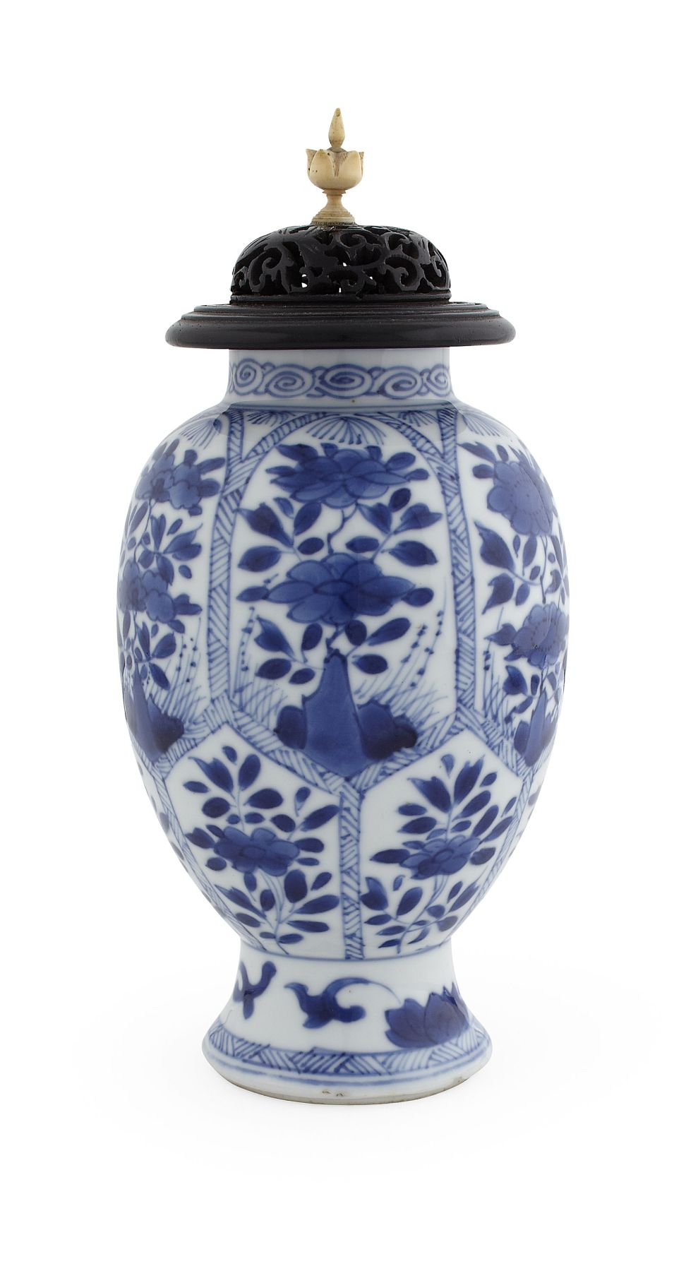with a pierced hardwood cover, the ovoid sides painted with panels of flowers