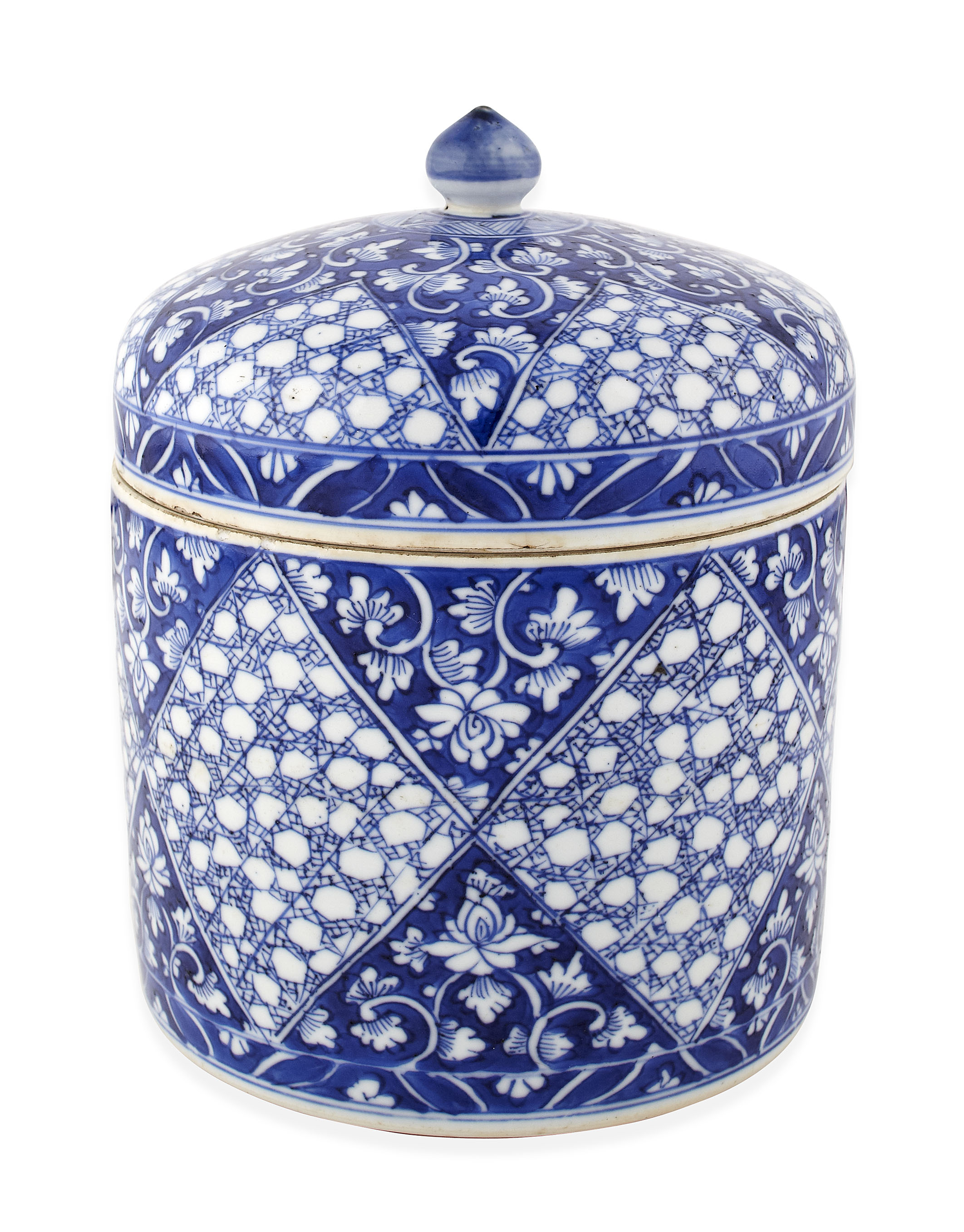 of cylindrical form, painted in underglaze blue, diamond shaped panels of cracked ice on a blue ground with scrolling leaves