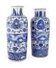 of cylindrical form with waisted neck, painted in underglaze blue with bands of stiff leaves, lotus scrolls and dragons