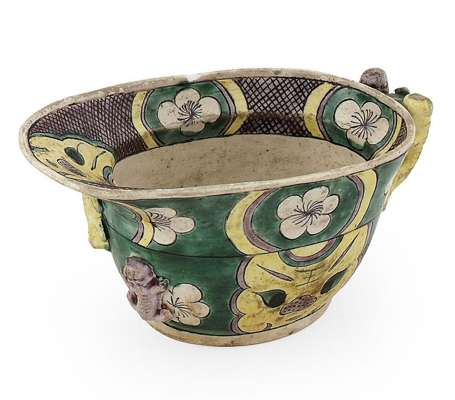 after an archaic bronze original, applied with Qialong, painted in famille verte enamels with Taotie masks and prunus