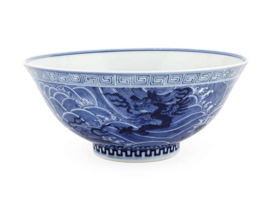 painted in underglaze blue with mythical beasts amongst waves within green key and borders, the interior with a similar circular panel, six character script mark in underglaze blue