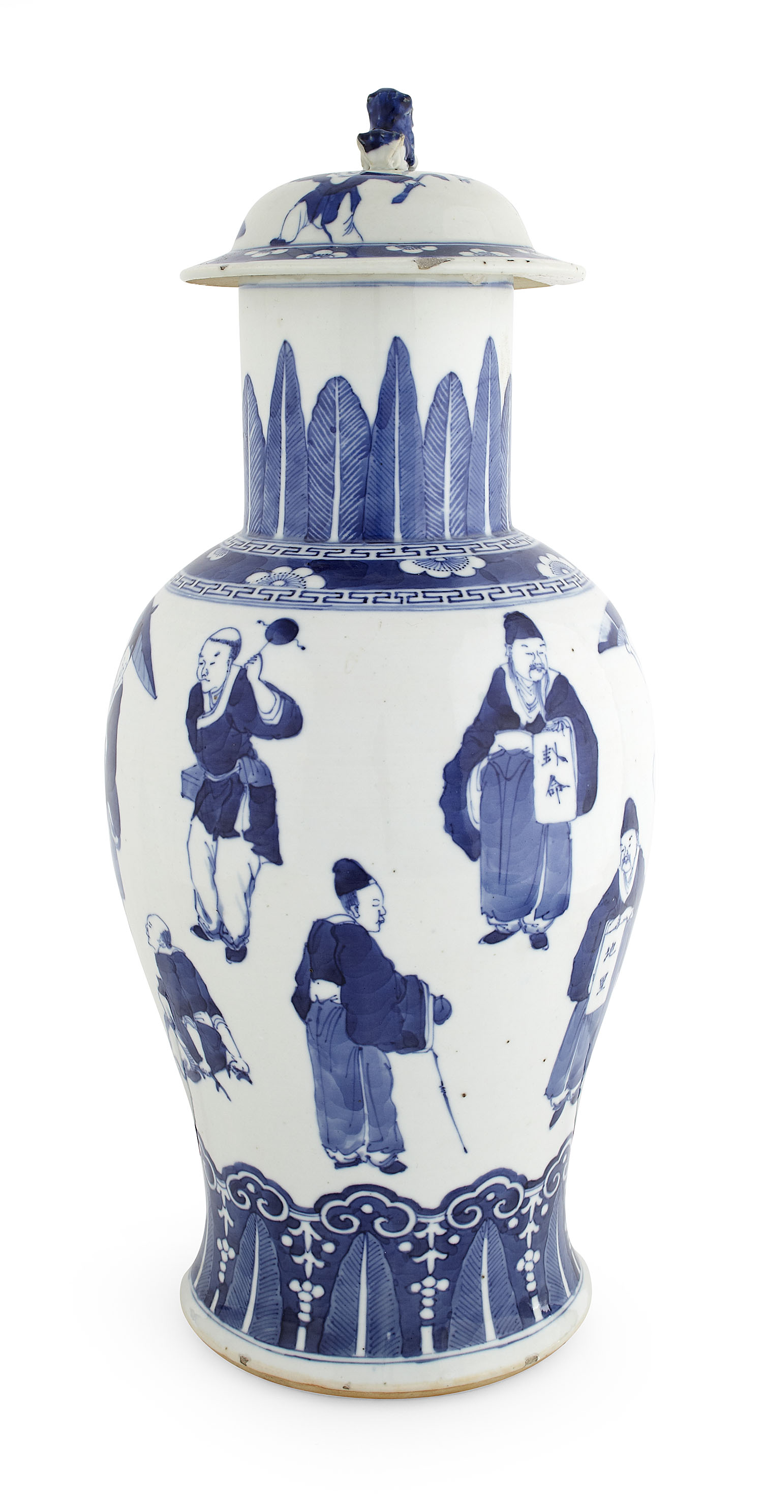 the associated domed lid with a fu lion finial, the sides painted with figures engaged in various pursuits