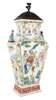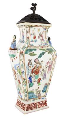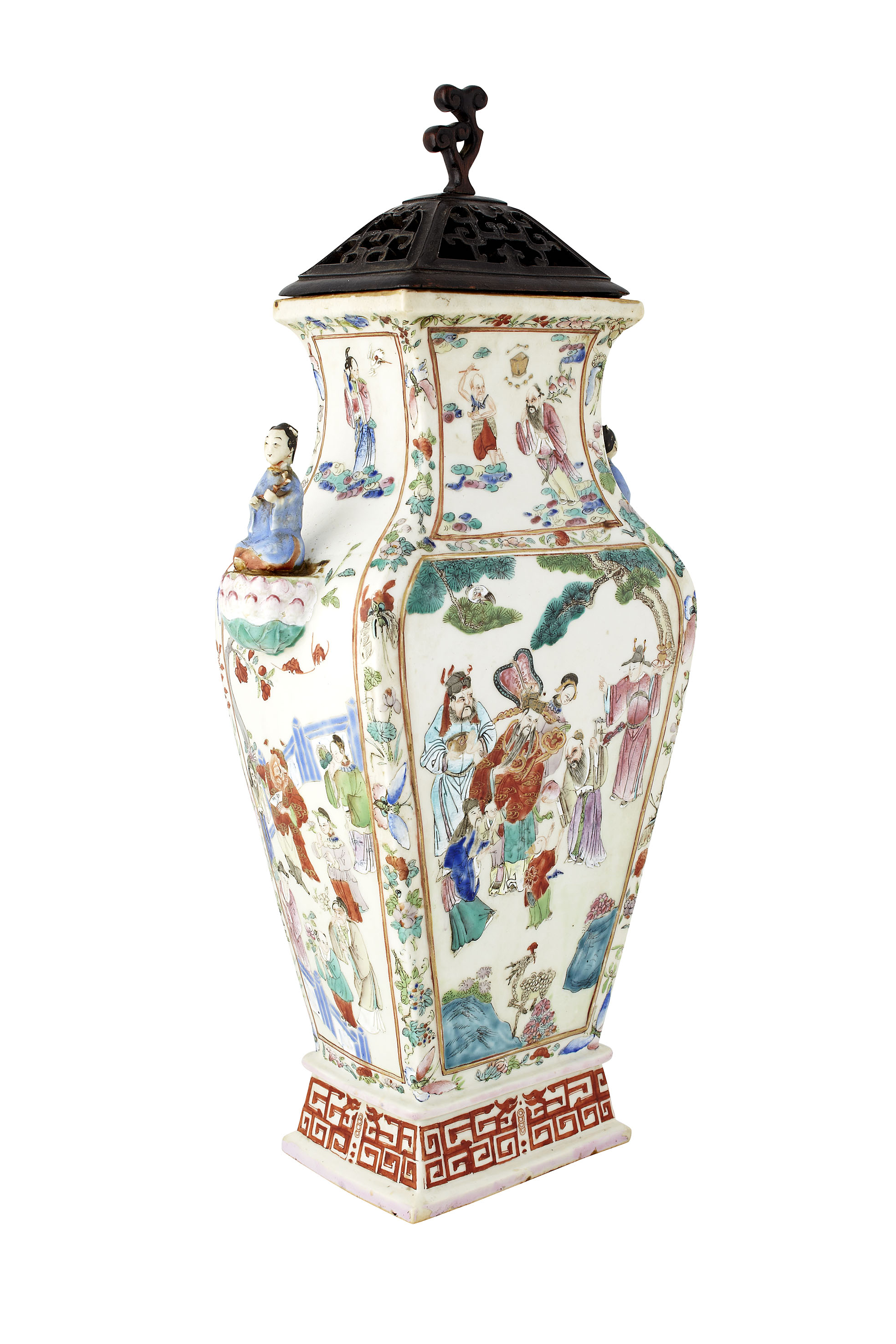 of flattened baluster form with flared neck and figural handles, painted in famille rose enamels with figures in panels on a foliate ground, matched pierced hardwood cover