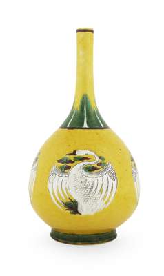 the sides decorated with four swans beneath a band of upright leaves, blue painted mark, drilled