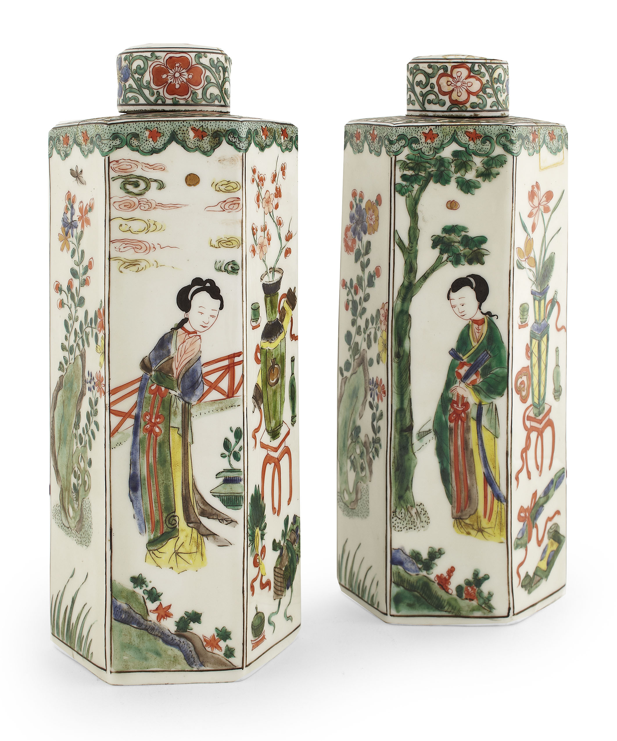 PAIR OF CHINESE FAMILLE VERTE HEXAGONAL TEA CANNISTERS