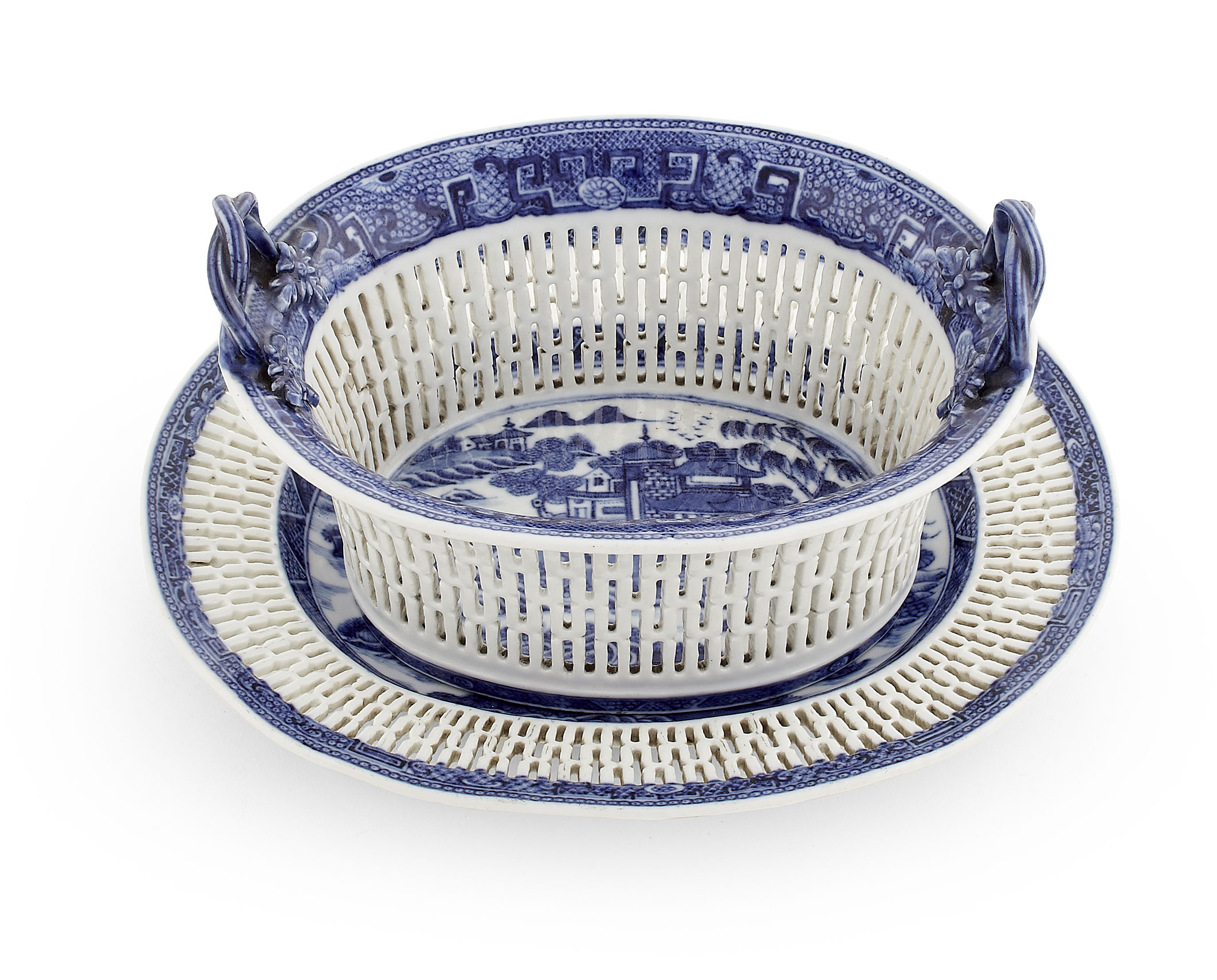 CHINESE BLUE AND WHITE EXPORT PIERCED CHESTNUT BASKET AND STAND