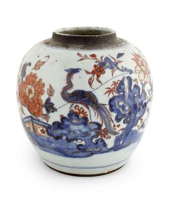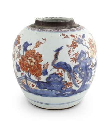 of globular form, the sides painted with phoenix in a walled garden, covers lacking