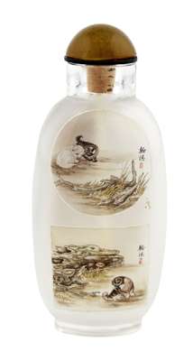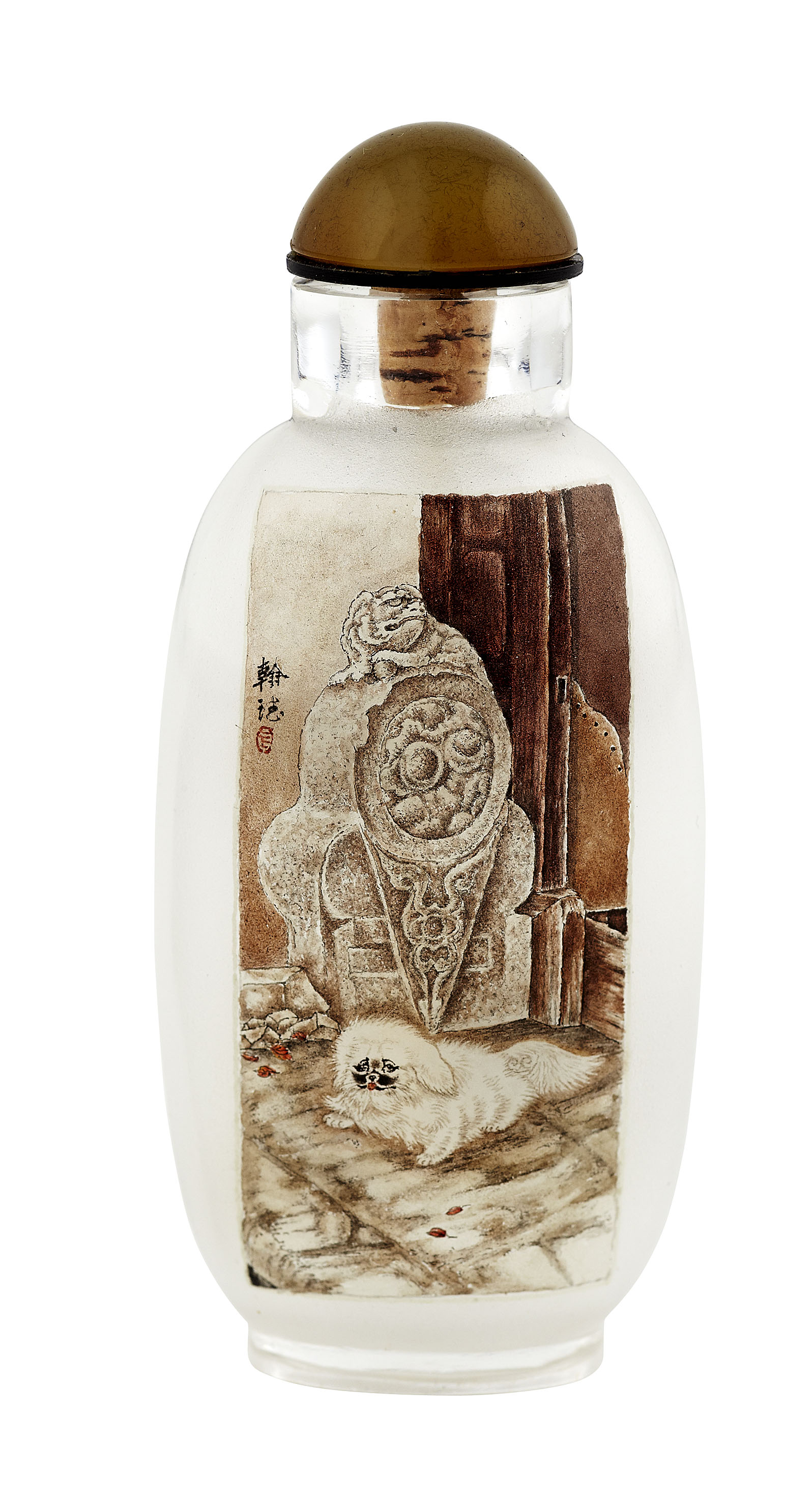 CHINESE INTERNALLY DECORATED GLASS SNUFF BOTTLE AND STOPPER