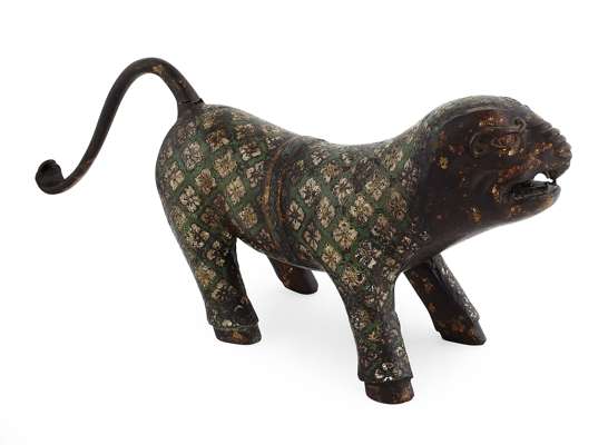 modelled with an open mouth bearing teeth, the body with white stylised floral diaper pattern against a green ground, with a blue banded strap around the midsection and a separately cast detachable tail, on hoof feet, the face, tail and underside in gold splash decoration