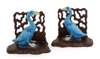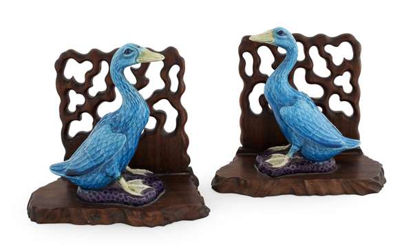 the carved openwork ends each surmounted by a turquoise glaze pottery figure of a standing Mandarin duck