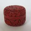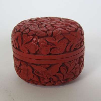of baluster form, carved with figures in landscape within foliate borders, 15.5cm high; TWO SIMILAR BOXES AND COVERS, 5cm and 6cm diameter; and a SIMILAR SMALL DISH, 10cm diameter (5)