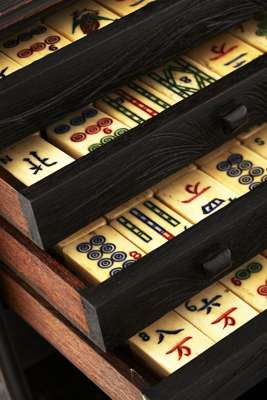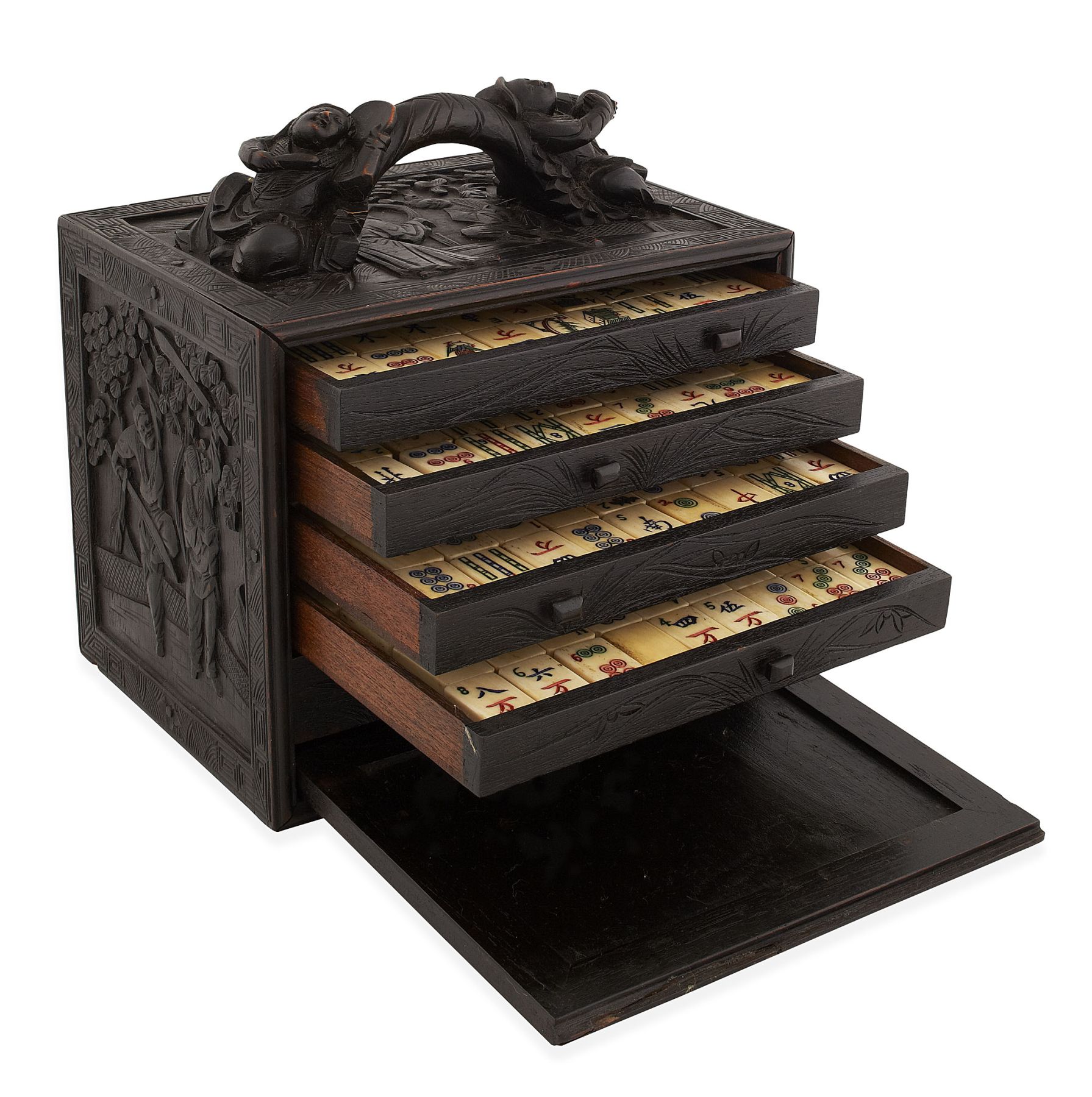 CHINESE CARVED STAINED SOFTWOOD MAHJONG SET